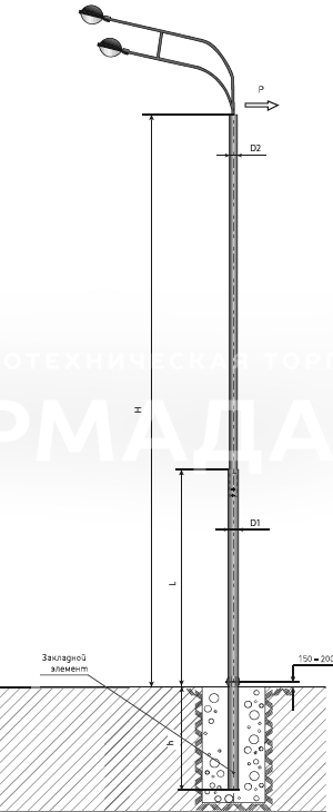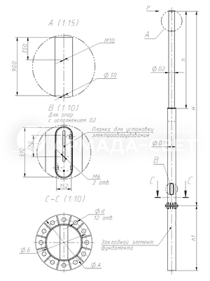 | Наименование опоры | Наименов-е закладного элем-та фундамента | Обознач-е установочн. места кронштейна | P, кг | H, мм | h1, мм | h, мм | D1, мм | D2, мм | d, мм | А, мм | Б, мм | Масса*, кг |